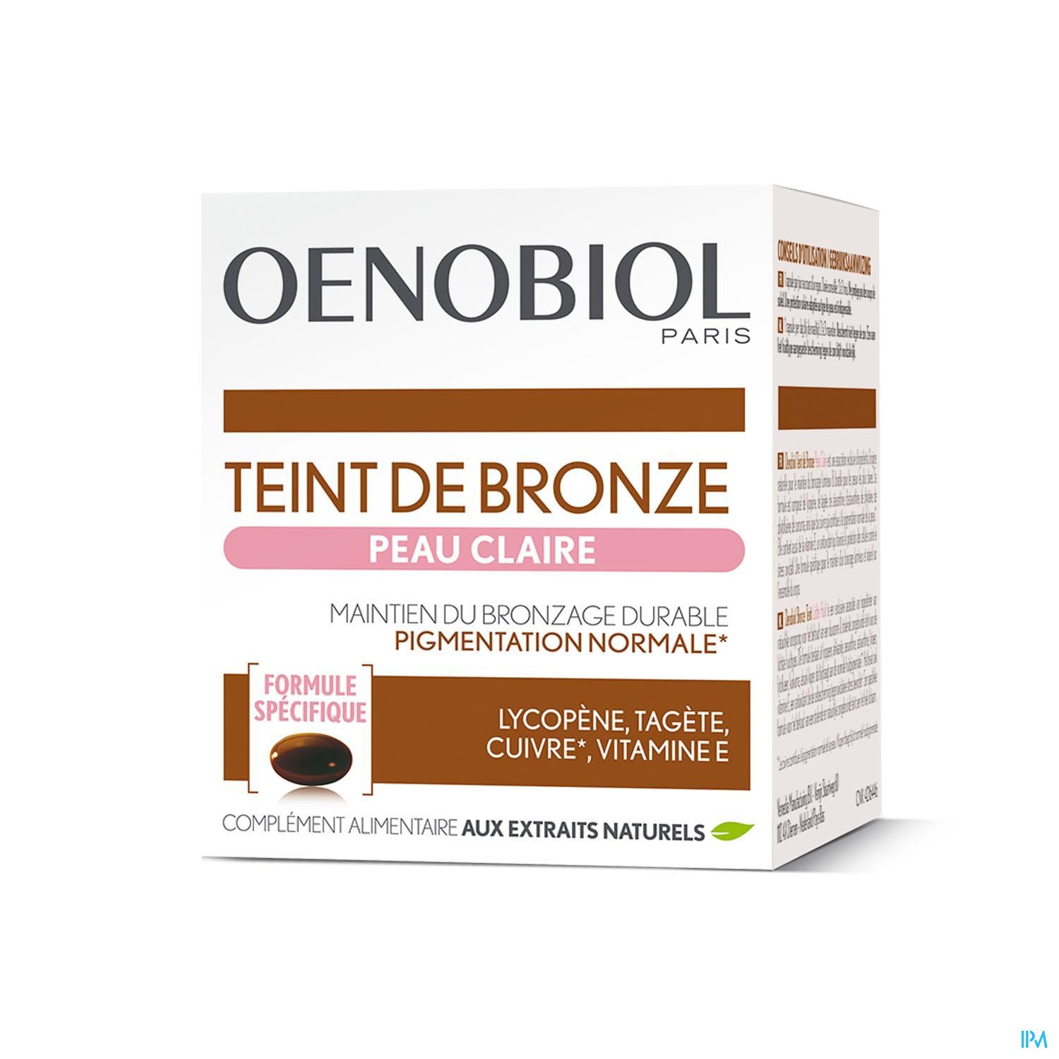 Oenobiol Teint de Bronze Peau Claire est une association exclusive d'ingrédients d'origine naturelle pour le maintien d'un bronzage durable et lumineux pour les peaux les plus claires. Sa formule spécifique est composée de lycopène, de tagète, de zéaxanthine, d'astaxanthine, de phytoène, de phytofluène et de curcuma. Elle contient aussi du cuivre qui contribue à la pigmentation normale de la peau* et de la vitamine E qui favorise la protection des cellules contre le stress oxydatif. Dès le premier mois, Oenobiol Teint de Bronze Peau Claire contribue au maintien d'un bronzage lumineux avec un rendu naturel sur l'ensemble du corps, sans tache ni trace sur la peau. Cette cure contient 30 capsules, pour 1 mois. Retrouvez les conditions du programme fidélité sur oenobiol.com : Recevez un produit gratuit à l'achat de 5 produits! *Le cuivre contribue à la pigmentation normale de la peau.