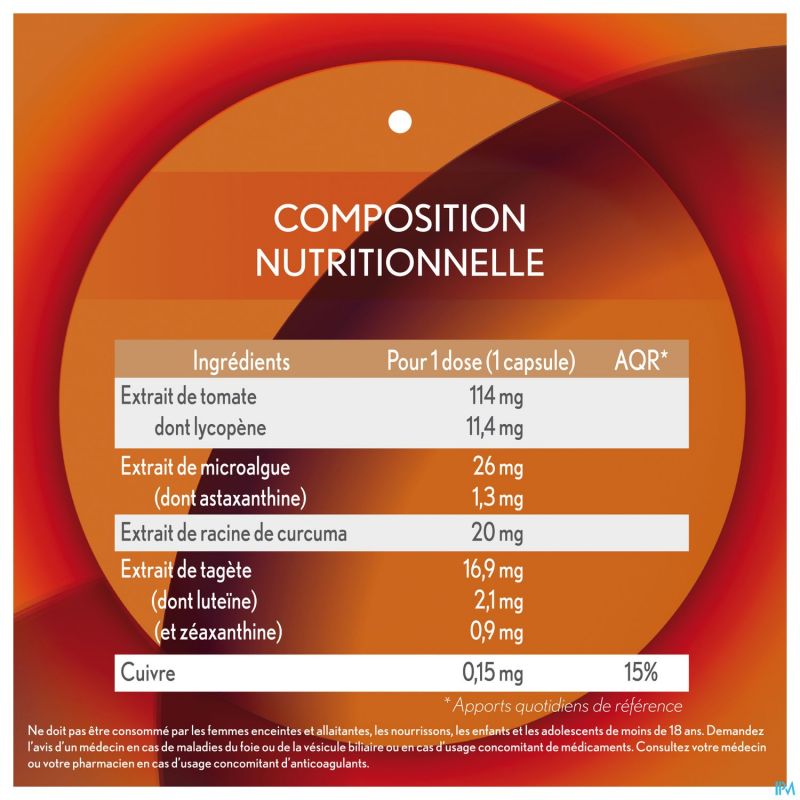 Huile végétale (huile de tournesol - Helianthus annuus L.), extrait de tomate (Lycopersicon esculentum Mill.), humectant (glycérol), gélifiant (amidon hydroxypropylé), emulsifiant (mono- et diglycérides d'acides gras), oléorésine riche en astaxanthine extraite de l'algue Haematococcus pluvialis, gélifiant (carraghénanes), extrait de curcuma (Curcuma longa L.), extrait de tagète (Tagetes erecta L.), eau, colorant (riboflavines), bisglycinate de cuivre.