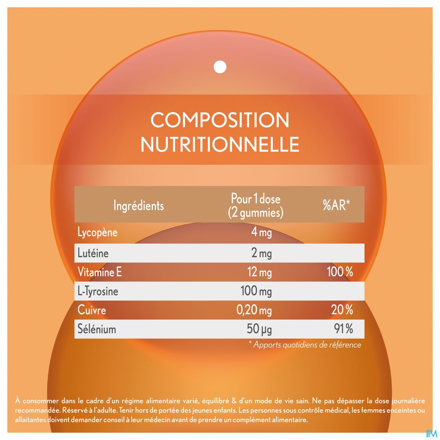 Agent de charge : maltitols - stabilisant : maltitols - L-tyrosine - gélifiant : pectines - acidifiant : acide citrique, acide malique, malates de sodium - acétate de dl-alpha-tocophéryle - arôme naturel - lycopène - arôme naturel de citron avec d'autres arômes naturels - sélénite de sodium - acidifiant : citrates de sodium - lutéine - concentrés de carthame (Carthamus tinctorius L.) et radis (Raphanus sativus L.) - citrate de cuivre.