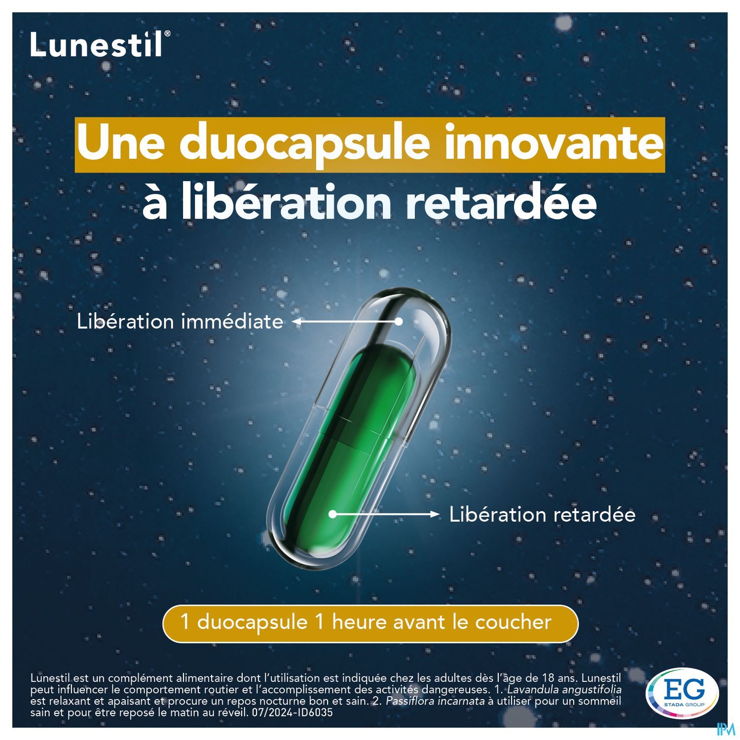 LUNESTIL est indiqué chez les adultes âgés d'au moins 18 ans. 1 duogélule par jour, 1 heure avant le coucher