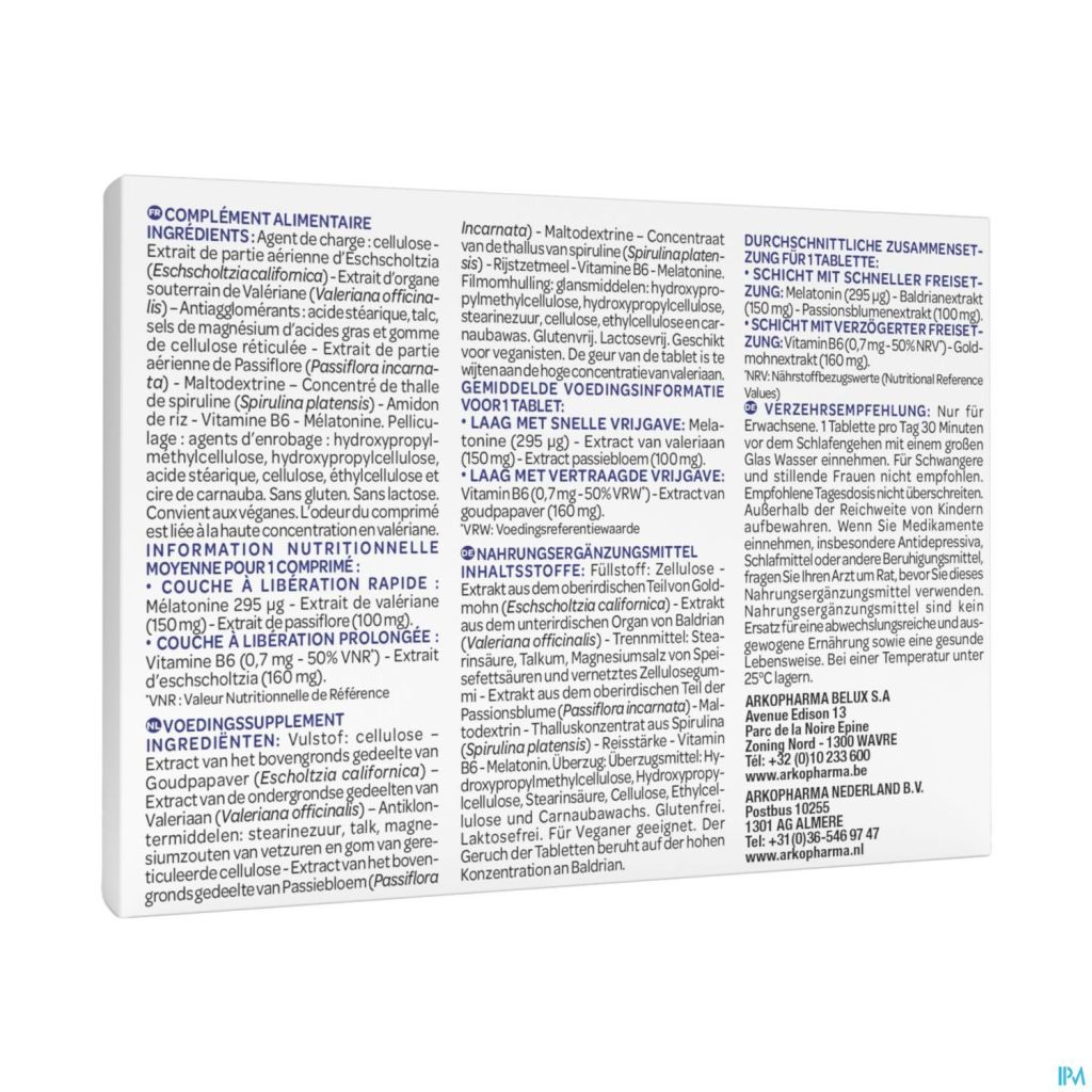 Agent de charge: cellulose - Extrait de la partie aérienne du pavot d'or(Elscholtzia californica Cham.) - Extrait des parties souterraines de la valériane(Valeriana officinalis L.) - Anti-agglomérants : acide stéarique, talc, stéarate de magnésium et gomme de cellulose réticulée.) - Anti-agglomérants : acide stéarique, talc, stéarate de magnésium et gomme de cellulose réticulée - Extrait des parties aériennes de laPassiflore (Passiflora incarnata L.) - Maltodextrine - Concentré de thalle de spiruline(Spirulina platensis (Gomont) Geitler) - Amidon de riz - Vitamine B6 - Mélatonine.