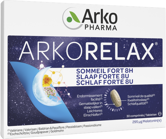 Arkorelax® Sleep Fortress 8U est un complément alimentaire à base de mélatonine, d'extraits de plantes et de vitamine B6. ARKORELAX® SLAAP FORT 8U vous garantit une nuit complète grâce à sa formule innovante de mélatonine à libération rapide et retardée et hautement concentrée en extraits de plantes connues pour leurs propriétés sur le sommeil. Ce produit ne provoque aucun effet secondaire et aucune somnolence au réveil.