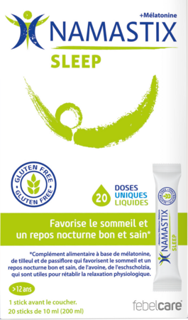 NAMASTIX® Sleep est un complément alimentaire à base de mélatonine, sous la forme de stick liquide facile à avaler, qui contribue à la réduction du temps nécessaire à l'endormissement et à un sommeil de qualité.