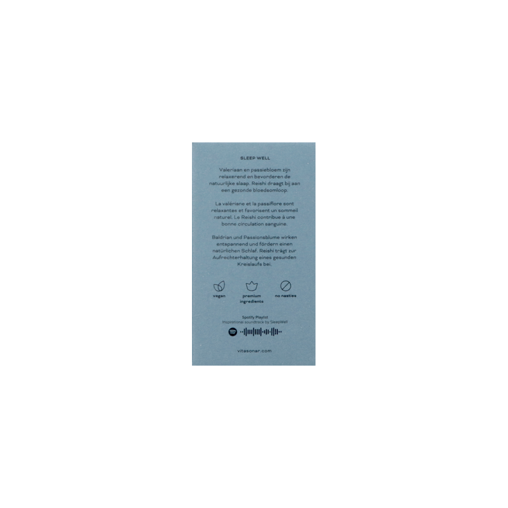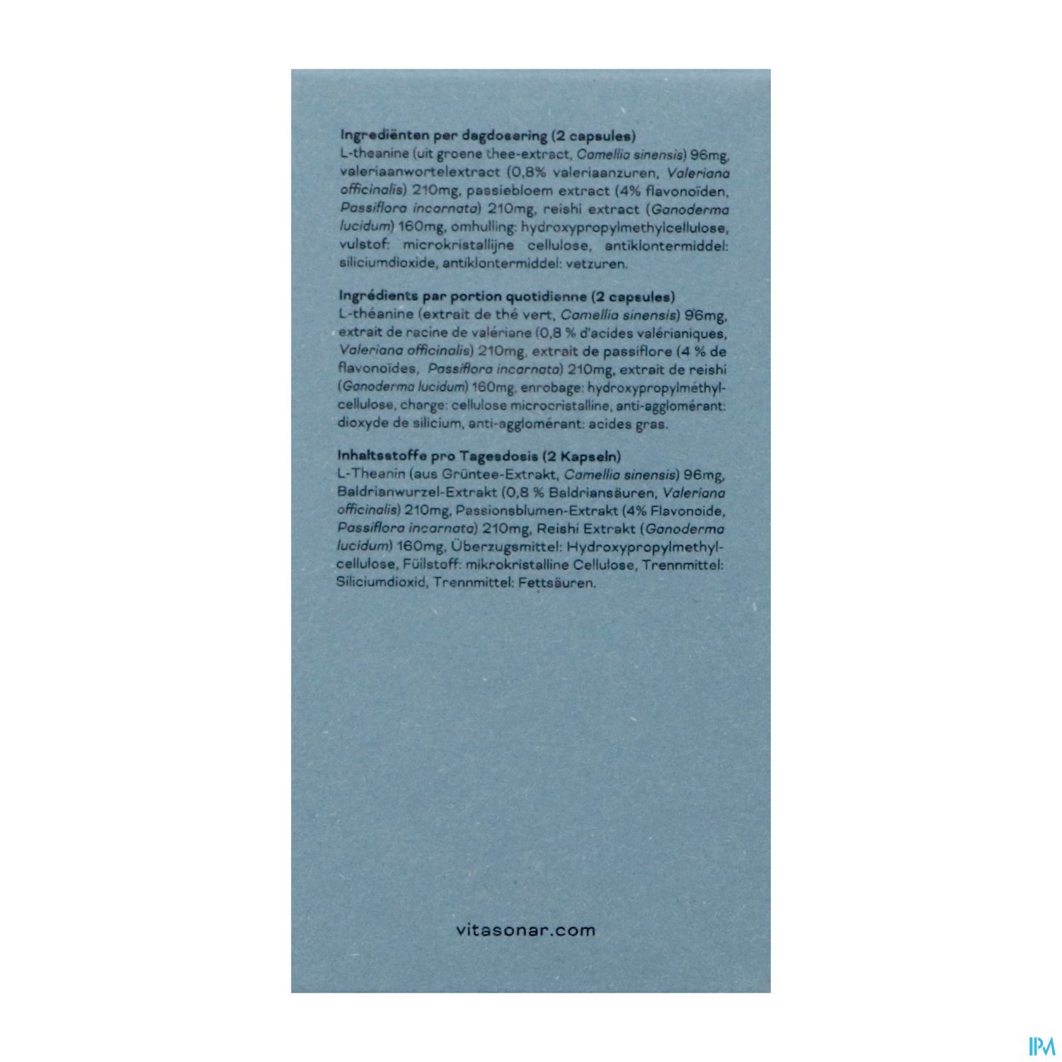 Par dose journalière (2 gélules) : L-théanine (extrait de thé vert, Camellia sinensis) 96 mg, extrait de racine de valériane (0,8 % d'acides valérianiques, Valeriana officinalis) 210 mg, extrait de passiflore (4 % de flavonoïdes, Passiflora incarnata) 210 mg, extrait de reishi (Ganoderma lucidum) 160 mg, enrobage : hydroxypropylméthylcellulose, charge : cellulose microcristalline, anti-agglomérant : dioxyde de silicium, anti-agglomérant : acides gras.