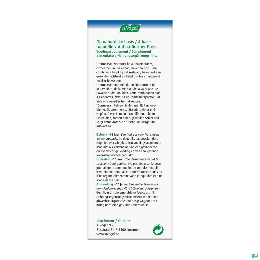 Les gouttes Dormeasan d'A.Vogel combinent cinq plantes : la valériane, le houblon, la passiflore, la mélisse et l'avoine. Ce mélange unique favorise l'endormissement, favorise un sommeil sain et aide à se réveiller frais et dispos. 100 % naturel et sans accoutumance.