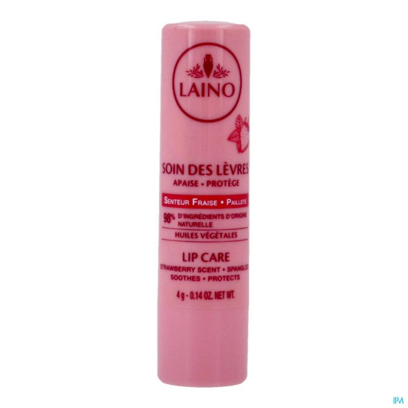 Laino a sélectionné les meilleurs principes actifs méditerranéens pour embellir vos lèvres avec un rouge à lèvres pailleté au parfum de fraise .