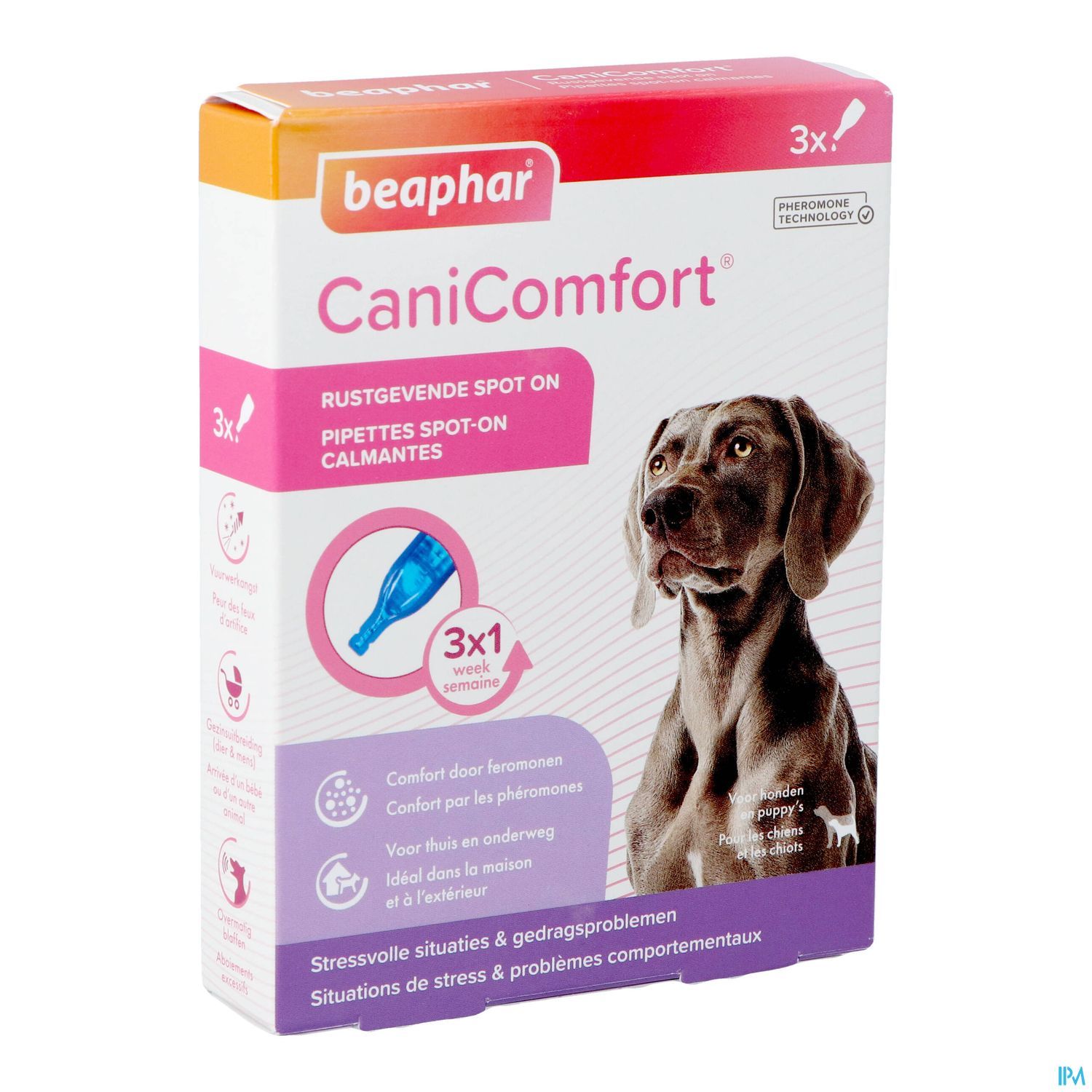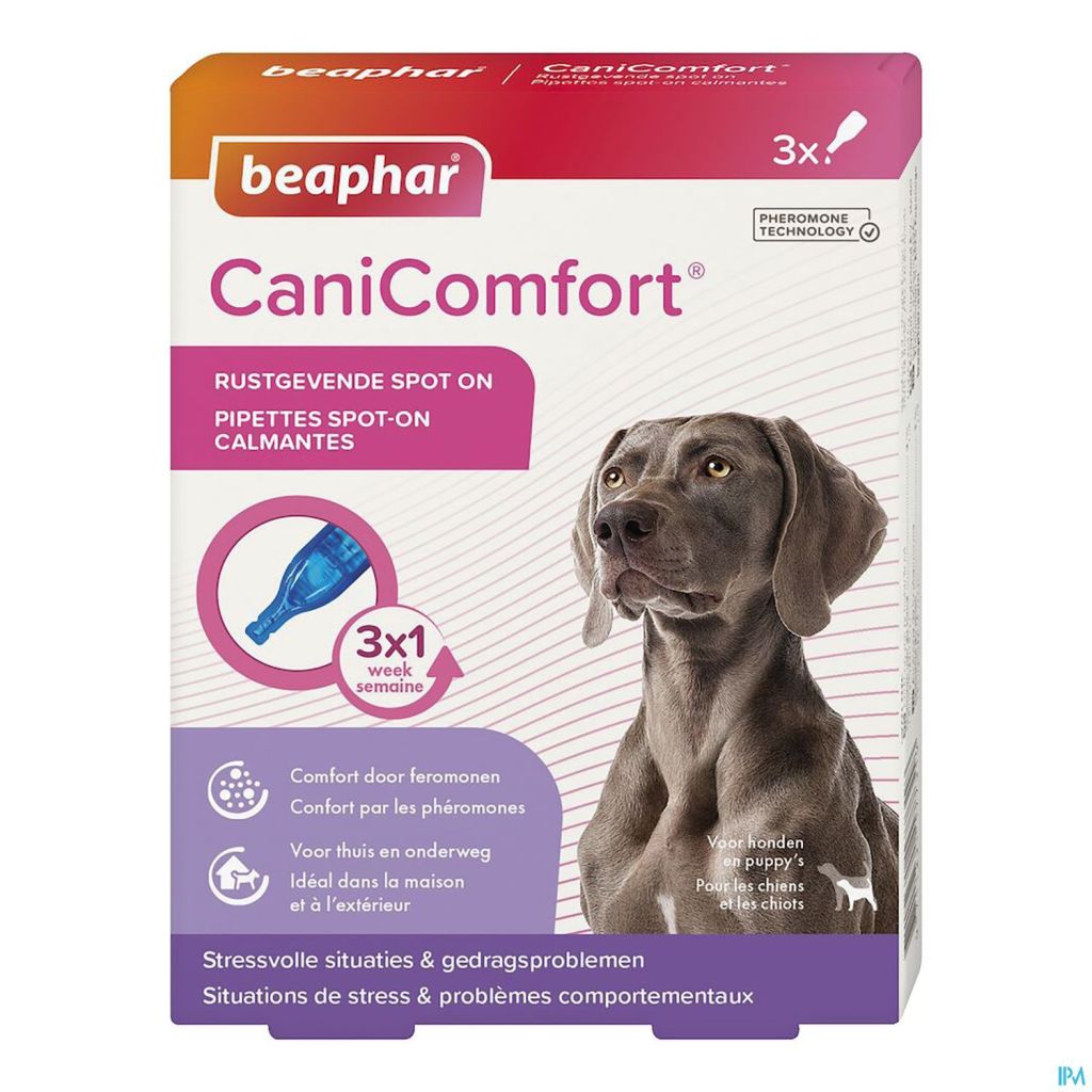La phéromone contenue dans Beaphar CaniComfort® est une solution simple et efficace, cliniquement prouvée, qui aide à prévenir les comportements indésirables et à calmer les chiens et les chiots. Beaphar CaniComfort® contient des phéromones qui sont reconnues par le chien, ce qui aide le chien, où qu'il soit, à se sentir à l'aise. Cela réduit les problèmes de comportement tels que les aboiements, la destruction des meubles, le comportement de marquage (uriner dans des endroits inappropriés), le léchage et le grattage excessifs, la dissimulation ou la peur. Lorsqu'une chienne allaite ses petits, elle émet la phéromone d'appel du chien (phéromone maternelle). En utilisant une copie de cette phéromone dans Beaphar CaniComfort®, le chien reçoit en permanence un message rassurant et cela aide le chien, où qu'il soit, à se sentir en sécurité et à l'aise. Beaphar CaniComfort® convient parfaitement aux situations nouvelles, telles que le dressage et la présentation à d'autres chiens, un nouvel environnement comme un déménagement, de nouveaux membres de la famille (humains ou animaux) ou d'autres situations stressantes comme les orages, les feux d'artifice et les bruits forts. Beaphar CaniComfort® Calming Spot On convient à toutes les races de chiens dès qu'ils quittent la litière. Il n'affecte pas les autres espèces du foyer et ne stupéfie pas les chiens. Ce produit peut être utilisé parallèlement à tout médicament. Il est idéal pour rassurer votre chien à la maison et sur la route et convient parfaitement aux voyages et aux séjours en pension.