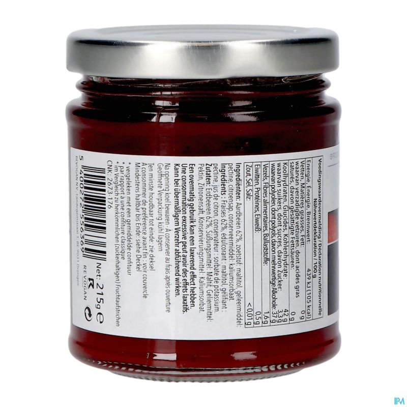 Fraises 62%, édulcorant : maltitol, gélifiant : pectine de pomme, jus de citron.