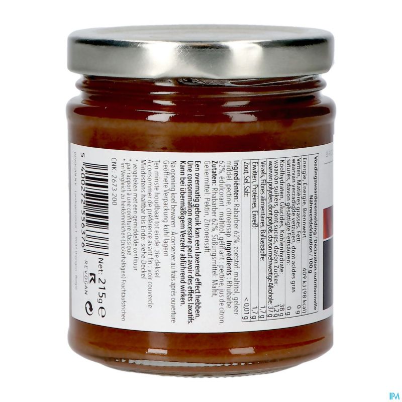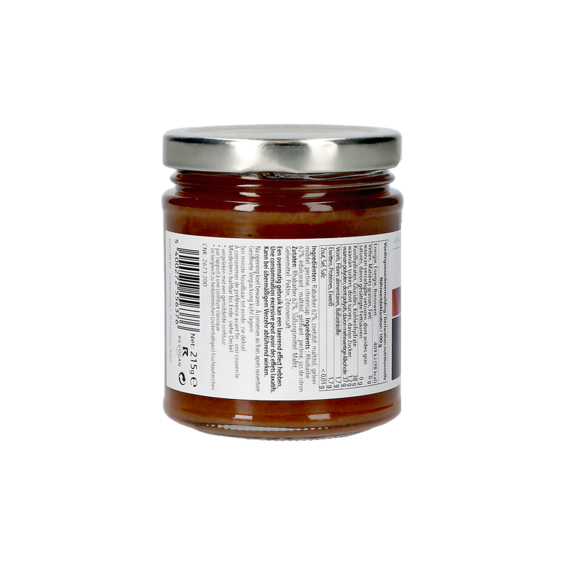 Rhubarbe 62%, édulcorant : maltitol, gélifiant : pectine de pomme, jus de citron.