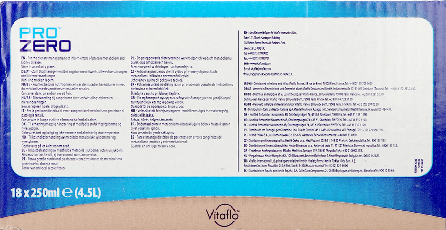 Boisson sans protéines pouvant être utilisée comme du lait, à utiliser comme aliment diététique dans les maladies congénitales du métabolisme des protéines et les maladies rénales, pour les enfants et les adultes suivant un régime pauvre en protéines. ProZero peut être utilisé seul ou facilement incorporé dans une large gamme de recettes sucrées et salées. ProZero est disponible en 2 saveurs : non aromatisé, pour les enfants à partir de 6 mois et saveur chocolat, pour les enfants à partir de 3 ans.