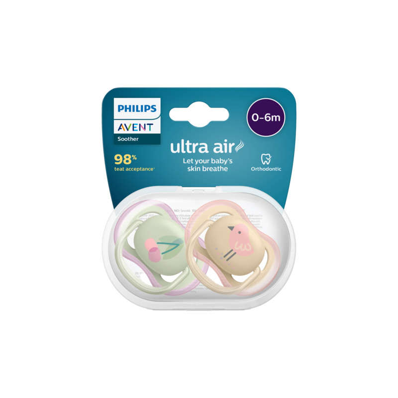 Apaisez votre bébé avec une sucette qui laisse la peau respirer. Le Philips Avent ultra air a des trous extra larges pour garder la peau sèche. Le bouclier léger est conçu pour une perméabilité à l'air maximale. Disponible en plusieurs couleurs et motifs.