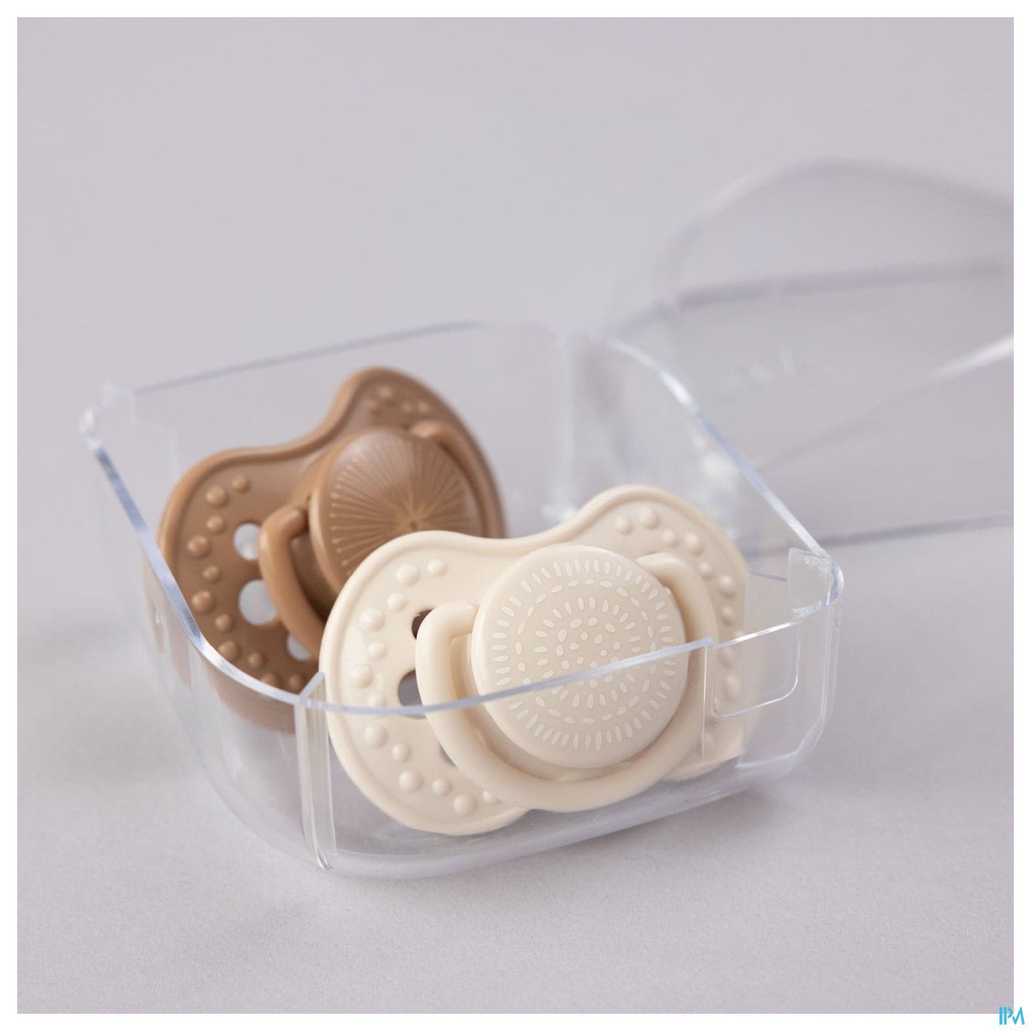 Harmony est une collection qui fait référence à des tendances telles que le minimalisme, la tranquillité et la connexion avec la nature. La partie suceuse de la sucette est dynamique et se compose de plusieurs couches de silicone de différentes épaisseurs. Grâce à ces couches, la partie supérieure de la succion se déplace au rythme de la succion naturelle.