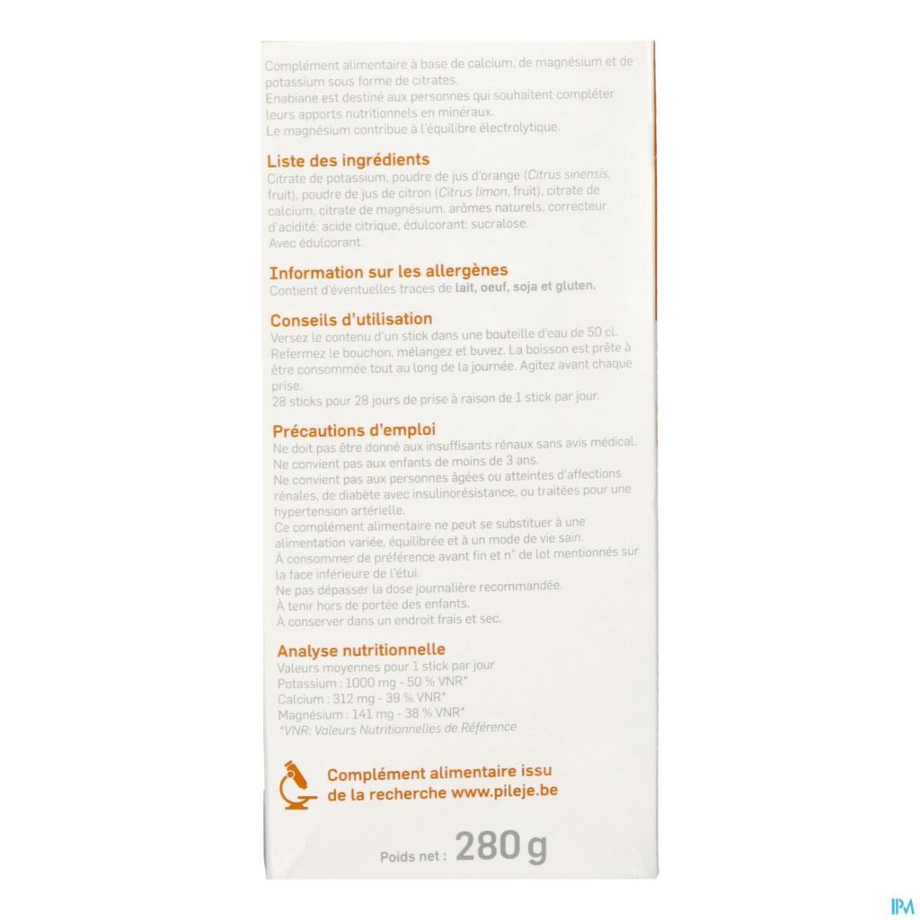Enabiane est une poudre à dissoudre dans les boissons pour renforcer l'apport nutritionnel, à base de calcium, de potassium et de magnésium, sous forme de citrate.