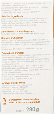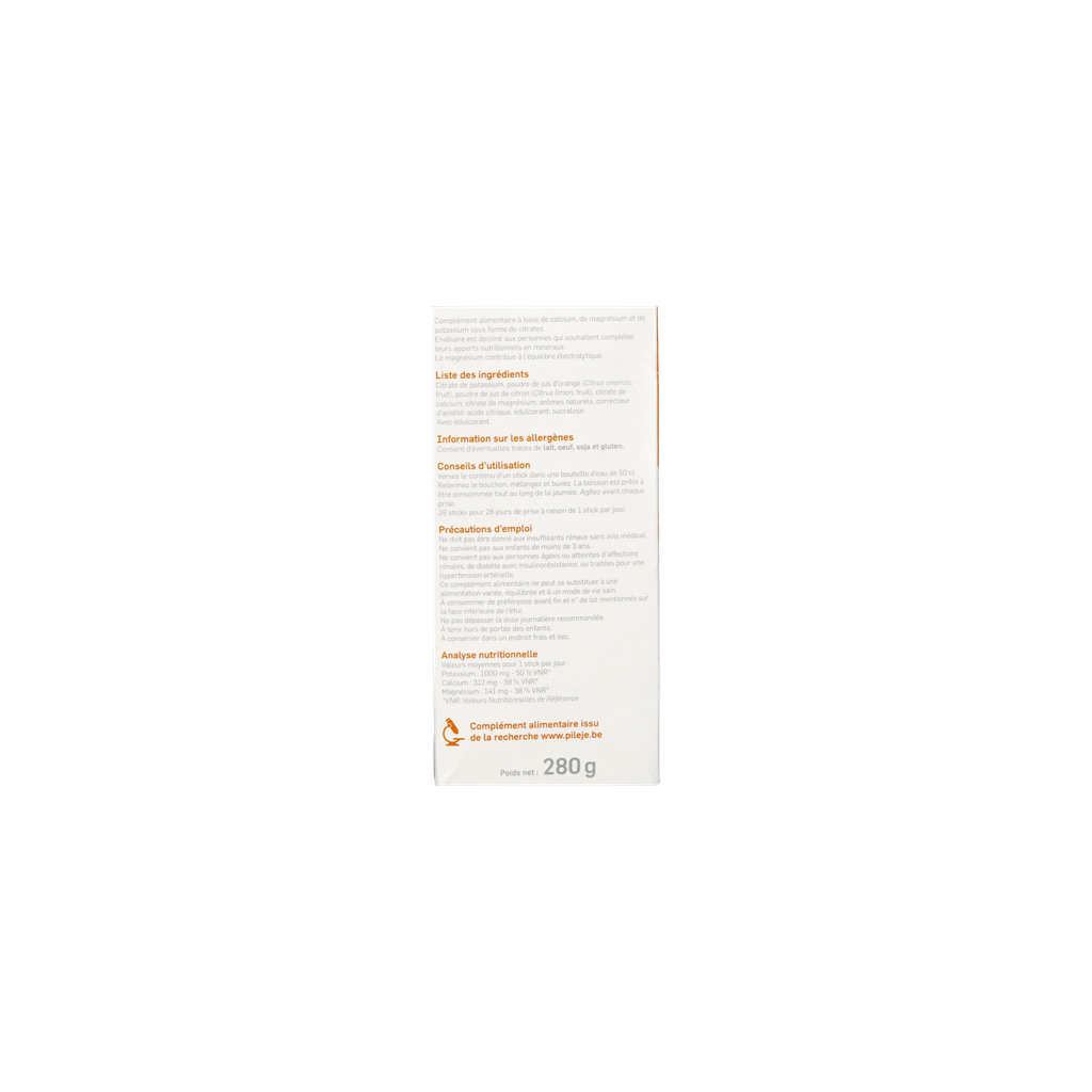 Sticks: Minéraux (citrate de potassium, citrate de calcium, citrate de magnésium), poudre de jus d'orange (19 %), poudre de jus de citron (18,6 %), arômes naturels, acide alimentaire : acide citrique, maltodextrines de blé, édulcorant : sucralose.