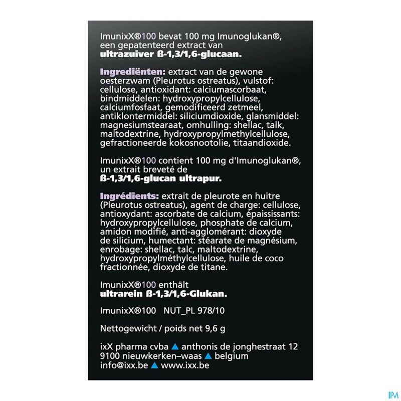 Imunixx 100 est un complément alimentaire à base de vitamine C et de ?-1,3/1,6-glucan (ultra pur et breveté, extrait de Pleurotus ostreatus, la pleurote). Imunixx soutient la résistance naturelle.