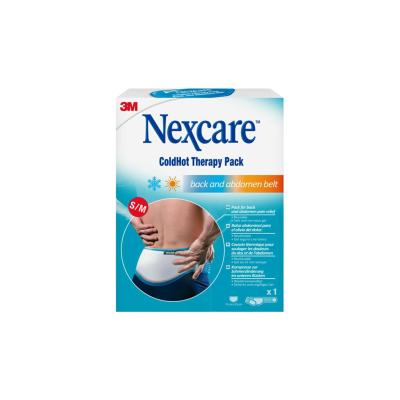 La ceinture à coussins thermiques Nexcare™ ColdHot permet d'apporter du froid ou de la chaleur superficiel. Le froid permet de réduire les gonflements, les inflammations et la douleur. La chaleur aide à réduire la douleur, apaise et détend. Le gel est non toxique et sûr pour toute la famille. Elle est disponible en deux tailles : de S à M, et de L à XL.