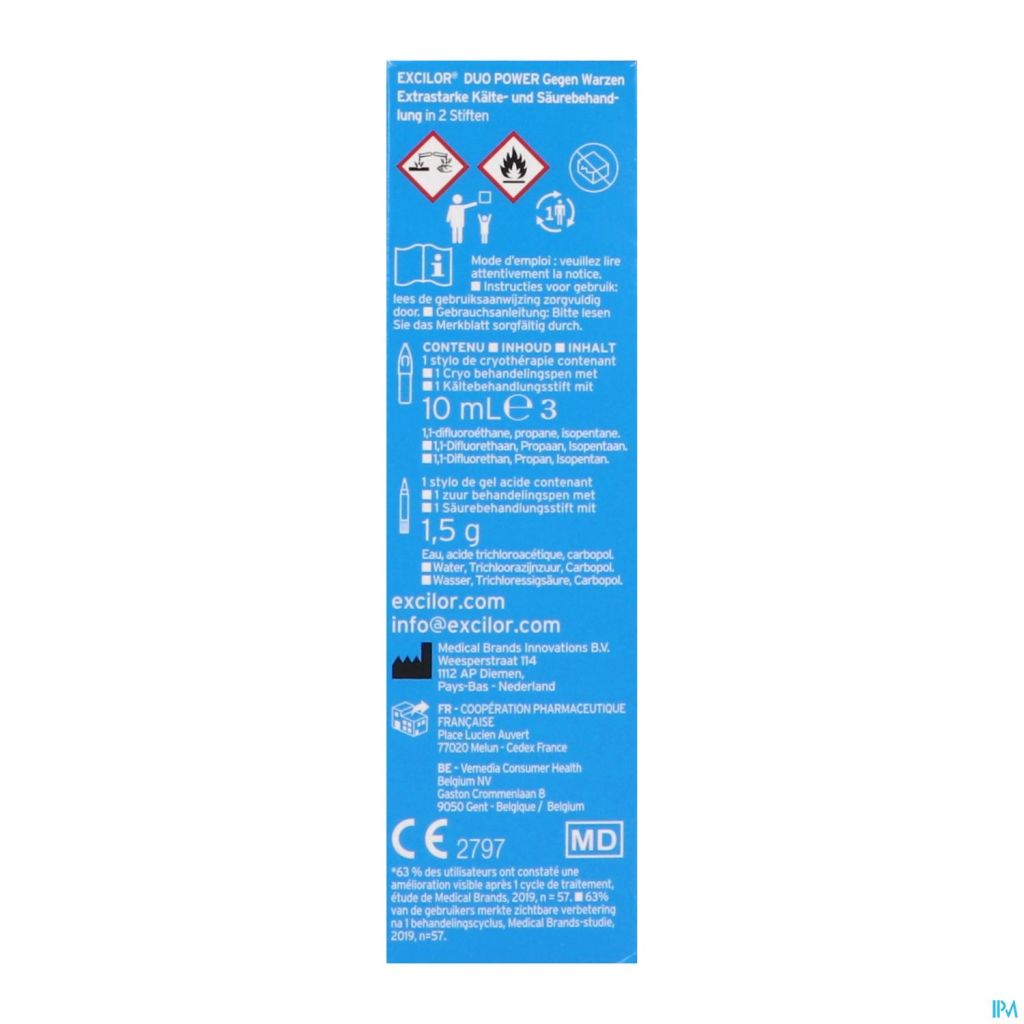 Excilor® Traitement des verrues DUO POWER contient deux stylos applicateurs: un stylo de cryothérapie et un stylo de gel acide .