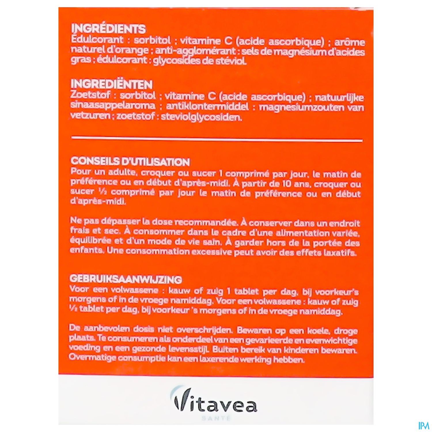 Édulcorant : sorbitol ; vitamine C (acide ascorbique) ; arôme naturel d'orange ; anti-agglomérant : sels de magnésium d'acides gras ; Édulcorant : glycosides de stéviol.