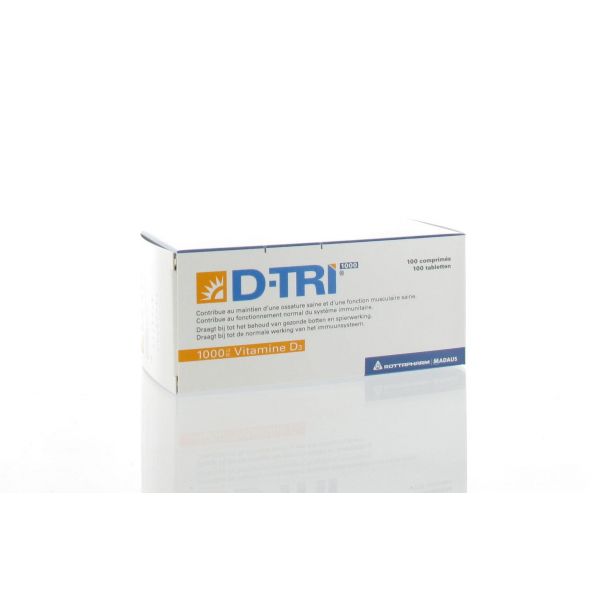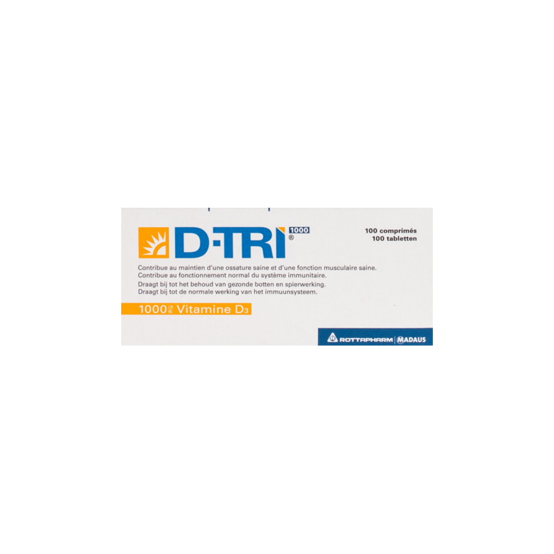 boîte de 100 comprimés D-TRI 1000 ne contient pas de gluten, de lactose, de gélatine, de colorants ni d'édulcorants.Ne pas conserver au-dessus de 25°C.