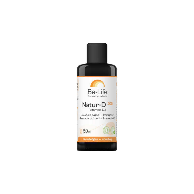 Natur-D 400 contient une dose physiologique (400 unités internationales) de vitamine D3 adaptée aux enfants. La vitamine D d'origine naturelle (mieux métabolisée que la forme synthétique) est ici associée à de l'huile TCM. Natur-D aide à renforcer l'immunité, à former et à maintenir des os et des dents solides et soutient le fonctionnement normal des muscles. La vitamine D remplit de nombreuses fonctions essentielles dans notre organisme :