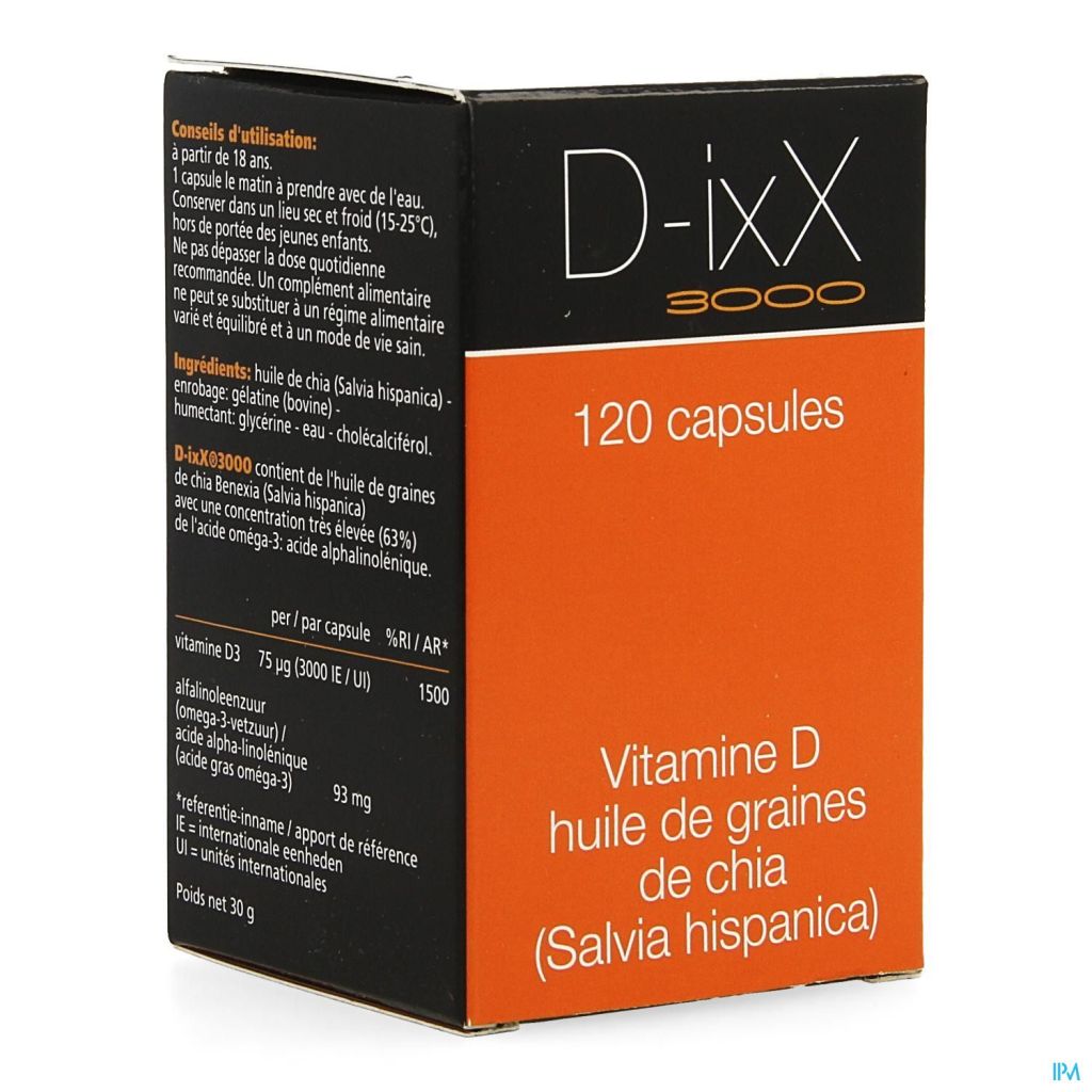 D-ixX 3000 contient 3000 UI* de vitamine D3 dans de l'huile de graines de chia.