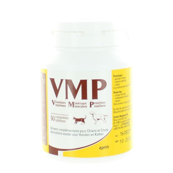 VMP est un aliment complémentaire des laboratoires Zoetis pour chiens et chats à base de vitamines, minéraux et protéines.