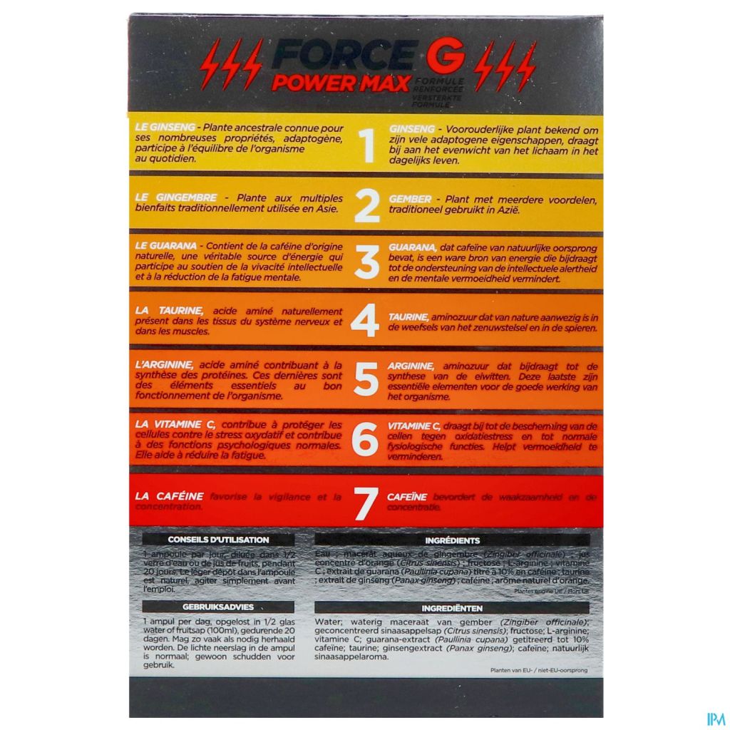 Force G Power Max est un complément alimentaire contenant du ginseng, du gingembre, du guarana, de la taurine, de l'arginine, de la vitamine C et de la caféine.