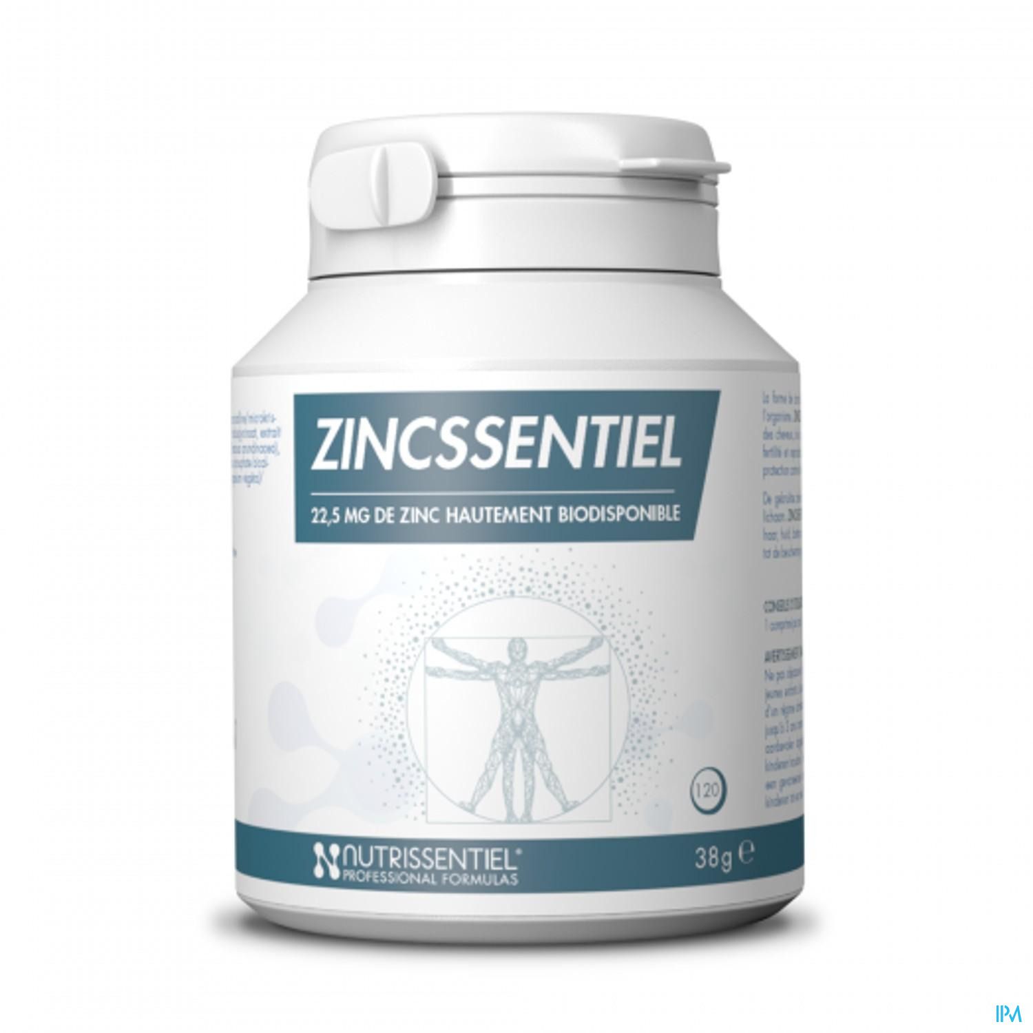 La forme de zinc utilisée est le bisglycinate de zinc. Cette forme est bien absorbée par l'organisme. ZINCSSENTIAL contient du zinc, qui contribue au maintien de la normalité des ongles, des cheveux, de la peau, des os, des fonctions cognitives, de la fertilité et de la reproduction, et à la protection contre le stress oxydatif.