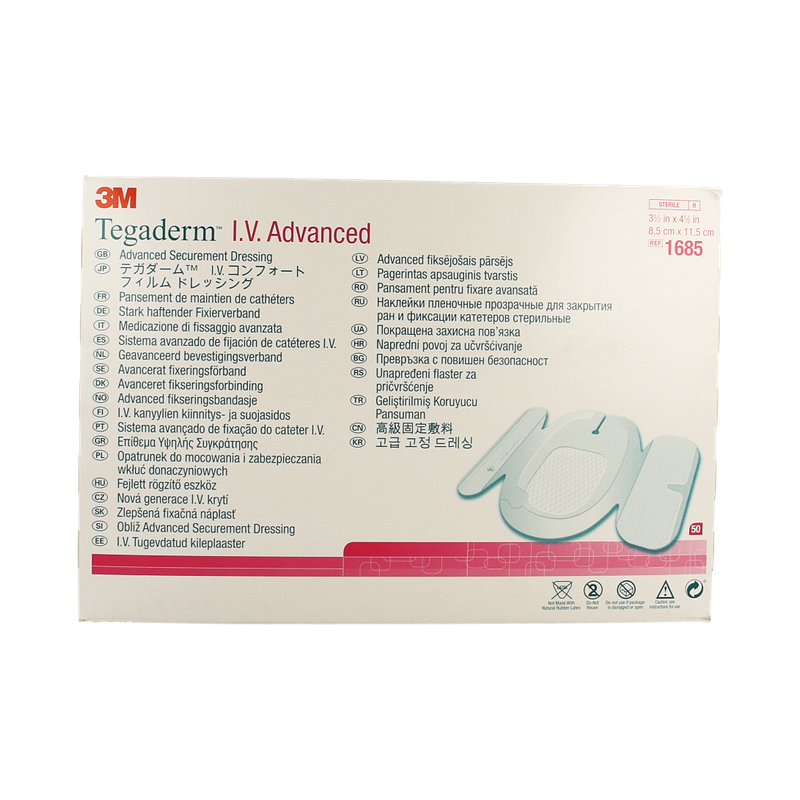 3M™ Tegaderm™ I.V. Advanced Securement Dressing is een steriel, transparant I.V. filmverband voor de geavanceerde fixatie van wonden. Onze verbanden hebben een sterke MVTR-barrière en zijn versterkt met soft cloth materiaal om loslaten van randen te beperken en om de insteekplaats van een infuus goed af te sluiten.