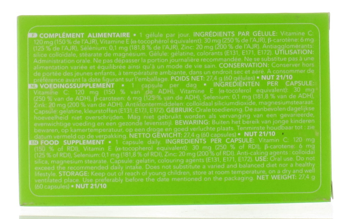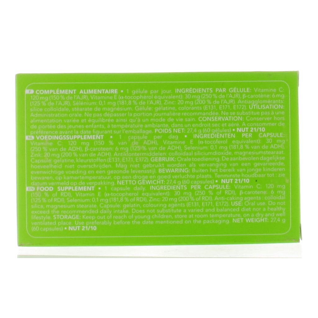 bèta-caroteen: 6 mg (125% ADH)vitamine E: equivalent aan 30 mg D-alfa-tocoferol (300% ADH) vitamine C: 120 mg (200% ADH) selenium: 100 µg (143% ADH) onder vorm van gist verrijkt met selenium zinc: 20 mg (133% ADH) onder vorm van zinkgluconaat