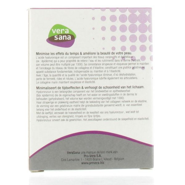 Hyaluronzuur 125 mg, Zeecollageen type I (vissenhuid) 100 mg, Hulpstoffen: Magnesiumstearaat 7 mg, Magnesiumsilicaat 21 mg en Colloïdaal Silica 7 mg.