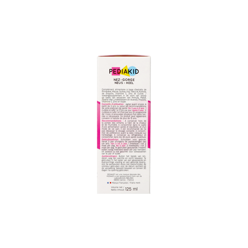 PEDIAKID® Neus-Keel combineert natuurlijke actieve bestanddelen om de luchtwegen (neus, keel, bronchiën...) te verzachten en vrij te maken bij de eerste tekenen. Tijm, sleutelbloem en linde verzachten de keel. Malva, zwarte vlier en gember verbeteren hetademhalingscomfort. Vitamine C en koper dragen bij aan de werking van het immuunsysteem, dat zorgt voor een goede natuurlijke afweer, wat vooral belangrijk is in de winter, een seizoen waarin mensen vaak binnen blijven.