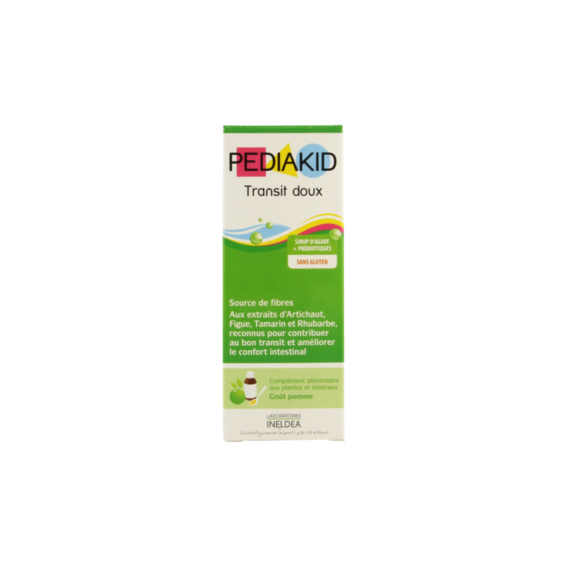 De agavesiroop maakt deel uit van alle PEDIAKID® siroopformules. Het wordt gemaakt in Mexico en bestaat uit natuurlijke, ongeraffineerde suiker, waardoor het zoeter en dunner is dan honing. Voor specifieke voedingswaarden. Voedingssupplement rijk aan artisjok, vijg, tamarine, rabarber, pruim, appel en magnesium. De PEDIAKID® Transit Doux siroop, samengesteld met planten- en fruitextracten, regelt op milde wijze de transit. De formule bevat artisjok, vijg, rabarber en tamarine en bevordert een goede spijsvertering, reguleert de darmtransit en verbetert het dagelijkse darmcomfort.