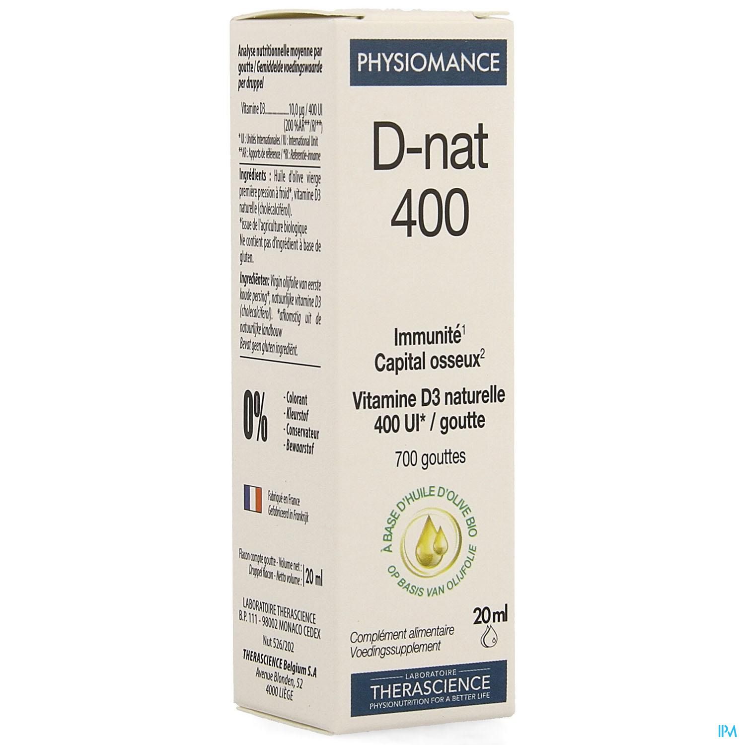 PHYSIOMANCE D-NAT 400 levert 400 IE* (10 μg) natuurlijke vitamine D3 per druppel, in een natuurlijke en biobeschikbare vorm.