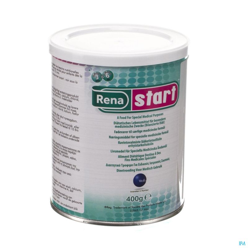 Renastart is een energierijke, poedervormige voeding die arm is aan eiwitten, kalium, fosfor, calcium, chloor en vitamine A. Bevat wei-eiwitten, aminozuren, koolhydraten, vetten, vitamines, mineralen, spoorelementen, docosahexaeenzuur (DHA) en arachidonzuur (ARA).