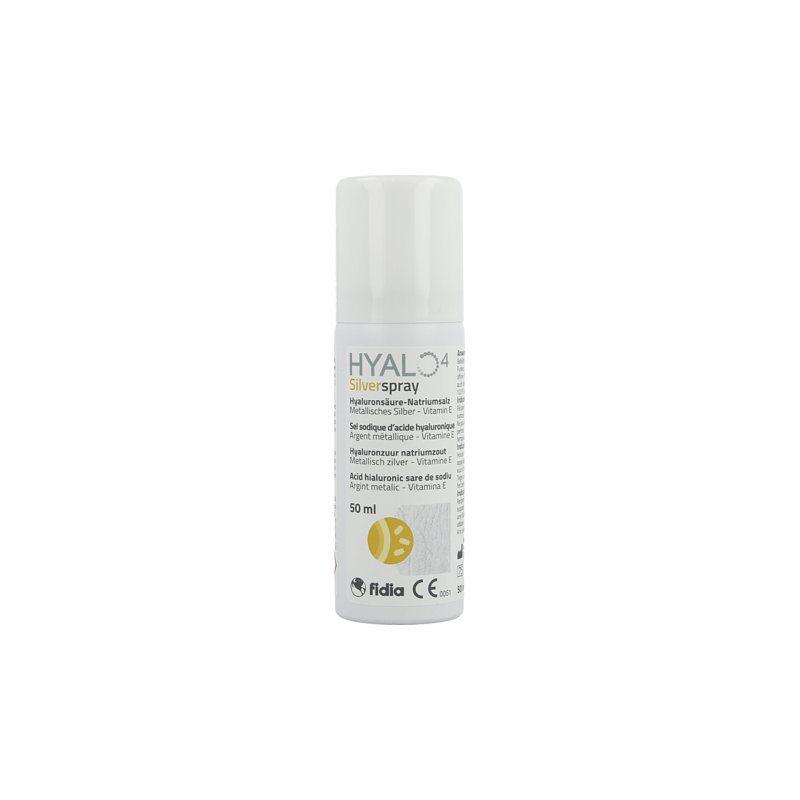 - HYALO4 Silver Spray is een suspensiespray voor topisch gebruik die hyaluronzuur, metallisch zilver en vitamine E bevat. Hyaluronzuur en zilver worden gecombineerd in een matrix (kaolien en zetmeel) met absorberende eigenschappen. De absorptie van het exsudaat creëert een omgeving die het natuurlijke weefselregeneratieproces vergemakkelijkt en vormt samen met hyaluronzuur en zilver een beschermende barrière tegen microbiële penetratie. De filmvormende werking van vitamine E, die het re-epithelialisatieproces ondersteunt, bevordert het herstel van de optimale vochtbalans in de huid.