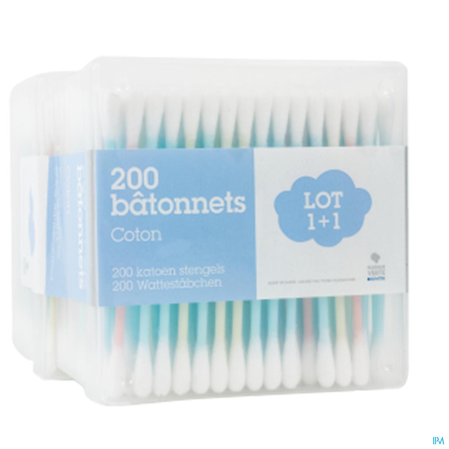 Een doos met 200 papieren wattenstaafjes met een kartonnen basis en hersluitbaar deksel.