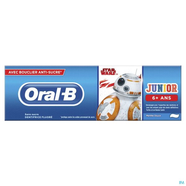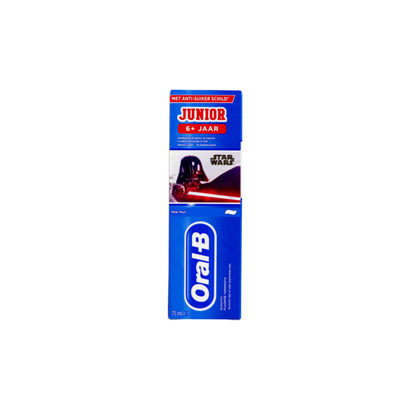 Oral-B Junior tandpasta met Star Wars-figuren is ontwikkeld met tandartsen, zodat kinderen hun mondgezondheid in eigen handen kunnen nemen. Beschermt tanden tegen zuren uit suikers in dagelijks voedsel. De milde muntsmaak is ideaal voor je opgegroeide junioren.