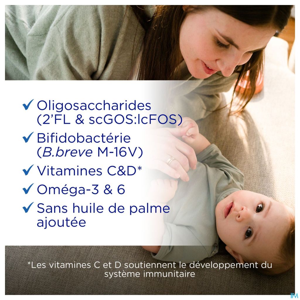Lactose (melk), plantaardige oliën (high oleic zonnebloemolie, kokosolie, koolzaadolie, zonnebloemolie in wisselende verhouding), magere melk, gedemineraliseerde wei (melk), galacto-oligosachariden (melk), wei concentraat (melk), eiwit (koemelk), fructo-oligosachariden, visolie, tricalciumfosfaat, kaliumchloride, olie van Mortierella alpina, natriumcitraat, 2'-Fucosyllactose (2'FL), cholinechloride, kaliumcitraat, magnesiumchloride, L-ascorbinezuur, magnesiumwaterstoffosfaat, emulgator (sojalecithine), taurine, inositol, bifidobacterium breve M-16V, ijzersulfaat, zinksulfaat, uridine 5'-monofosfaat natrium zout, cytidine 5'-monofosfaat, antioxidant (ascorbylpalmitaat), adenosine 5'-monofosfaat, inosine 5'-monofosfaat natrium zout, L-carnitine, nicotinamide, calcium D-pantothenaat, guanosine 5'-monofosfaat natrium zout, kopersulfaat, DL-α-tocoferylacetaat, retinylpalmitaat, riboflavine, thiaminehydrochloride, pyridoxinehydrochloride, kaliumjodide, pteroylmonoglutaminezuur, mangaansulfaat, natriumseleniet, fytomenadion, cholecalciferol, D-biotine, cyanocobalamine.