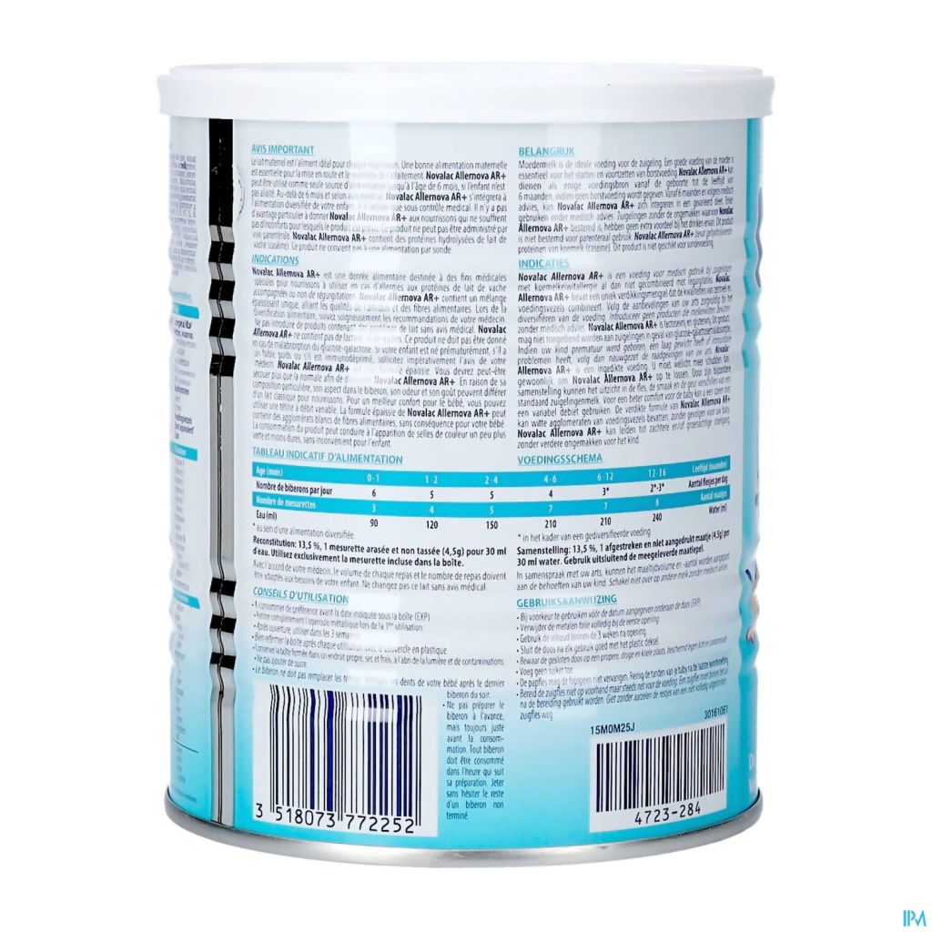 Novalac Allernova AR is een voeding voor baby's en kinderen met koemelkallergie of die vaak spugen. Het is een ingedikte, lactosevrije voeding die gehydrolyseerde koemelkeiwitten (caseïne) bevat. Allernova AR kan worden gegeven vanaf dag 1 tot 36 maanden. In de eerste 6 levensmaanden kan Allernova AR ook als enige voedingsbron gebruikt worden. Ook pap kan met Allernova AR bereid worden. Allernova AR bevat bovendien alle belangrijke voedingsstoffen die je kindje nodig heeft voor groei en ontwikkeling.