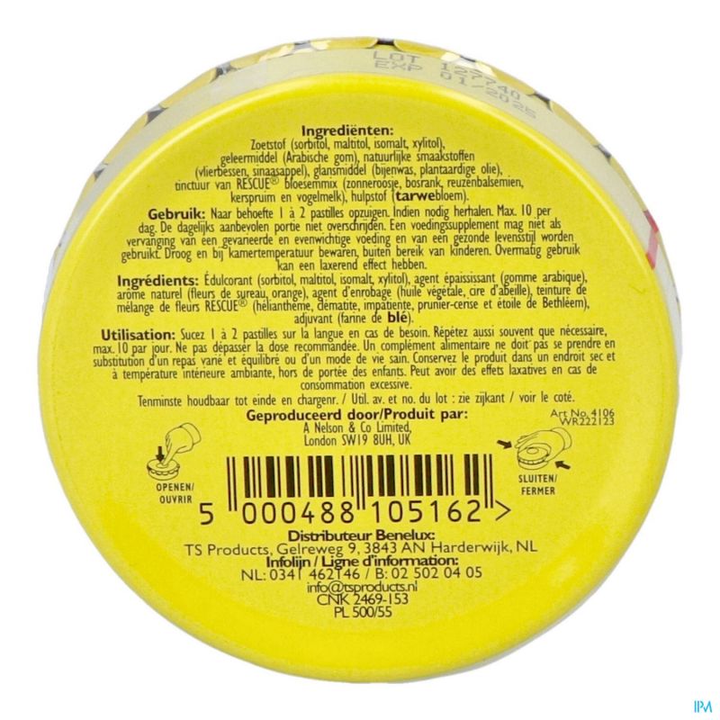 Zoetstoffen (sorbitol, maltitol, isomalt, xylitol), geleermiddel (Arabische gom), zuurteregelaar (citroenzuur), natuurlijke smaakstoffen (vlierbessen, sinaasappel), glansmiddel (plantaardige olie, bijenwas), tinctuur van Rescue bloesemmix (zonneroosje, bosrank, reuzenbalsemien, kerspruim en vogelmelk), hulpstof tarwebloem. Kan sporen van gluten bevatten.