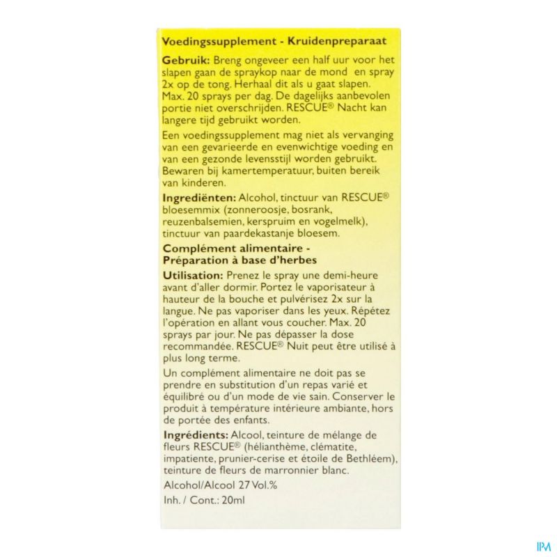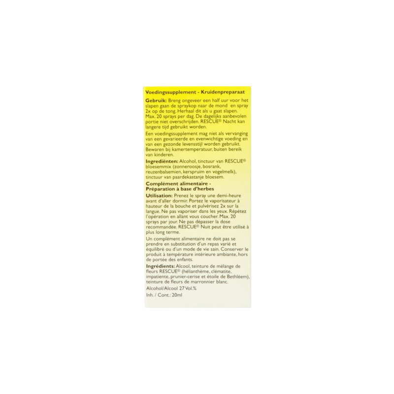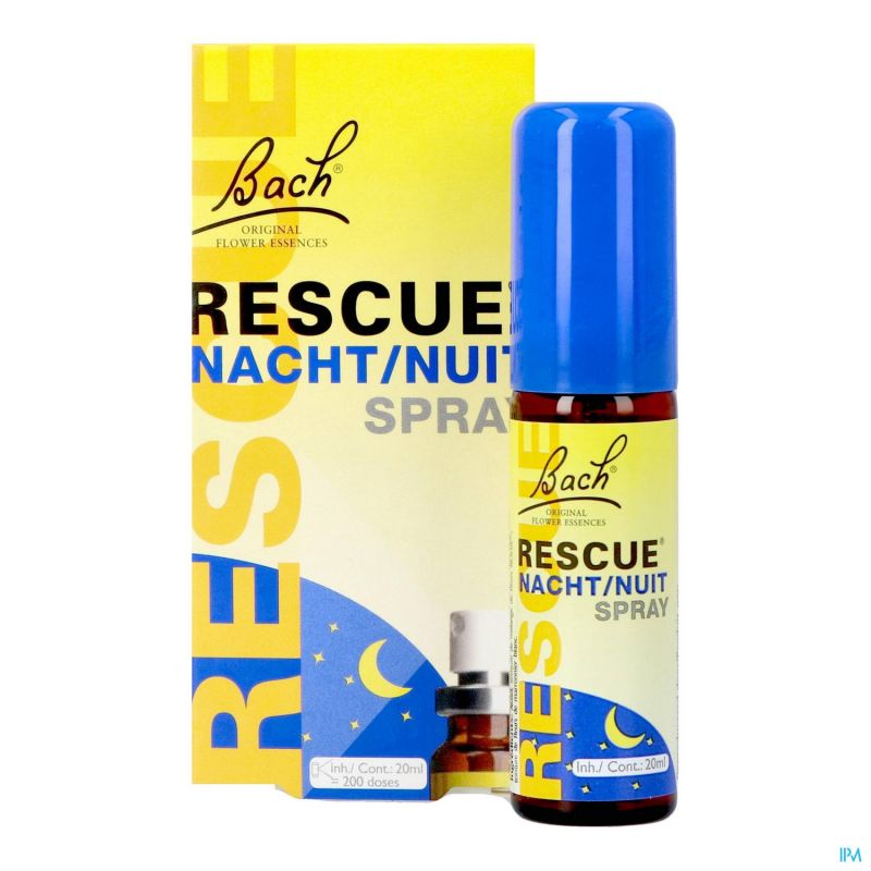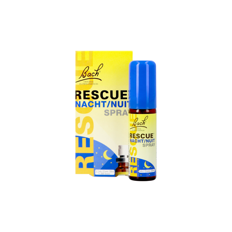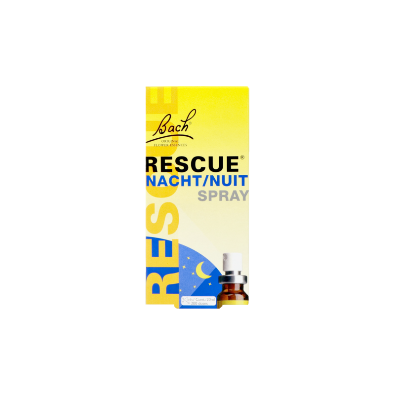 RESCUE® Nacht is beschikbaar in druppels 10ml en een handige spray van 7ml of 20 ml. Innemen voor het slapen gaan. Dit product is een originele formule van Edward Bach. De originele RESCUE® en Bach bloesem remedies uit Mount Vernon (UK), de woon- en werkplaats van Dr. Bach, herkent u aan de Bach handtekening.