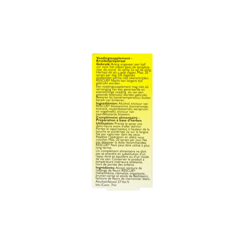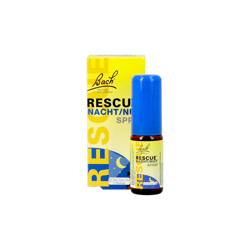 RESCUE® Nacht is beschikbaar in druppels 10ml en een handige spray van 7ml of 20 ml. Innemen voor het slapen gaan. Dit product is een originele formule van Edward Bach. De originele RESCUE® en Bach bloesem remedies uit Mount Vernon (UK), de woon- en werkplaats van Dr. Bach, herkent u aan de Bach handtekening.