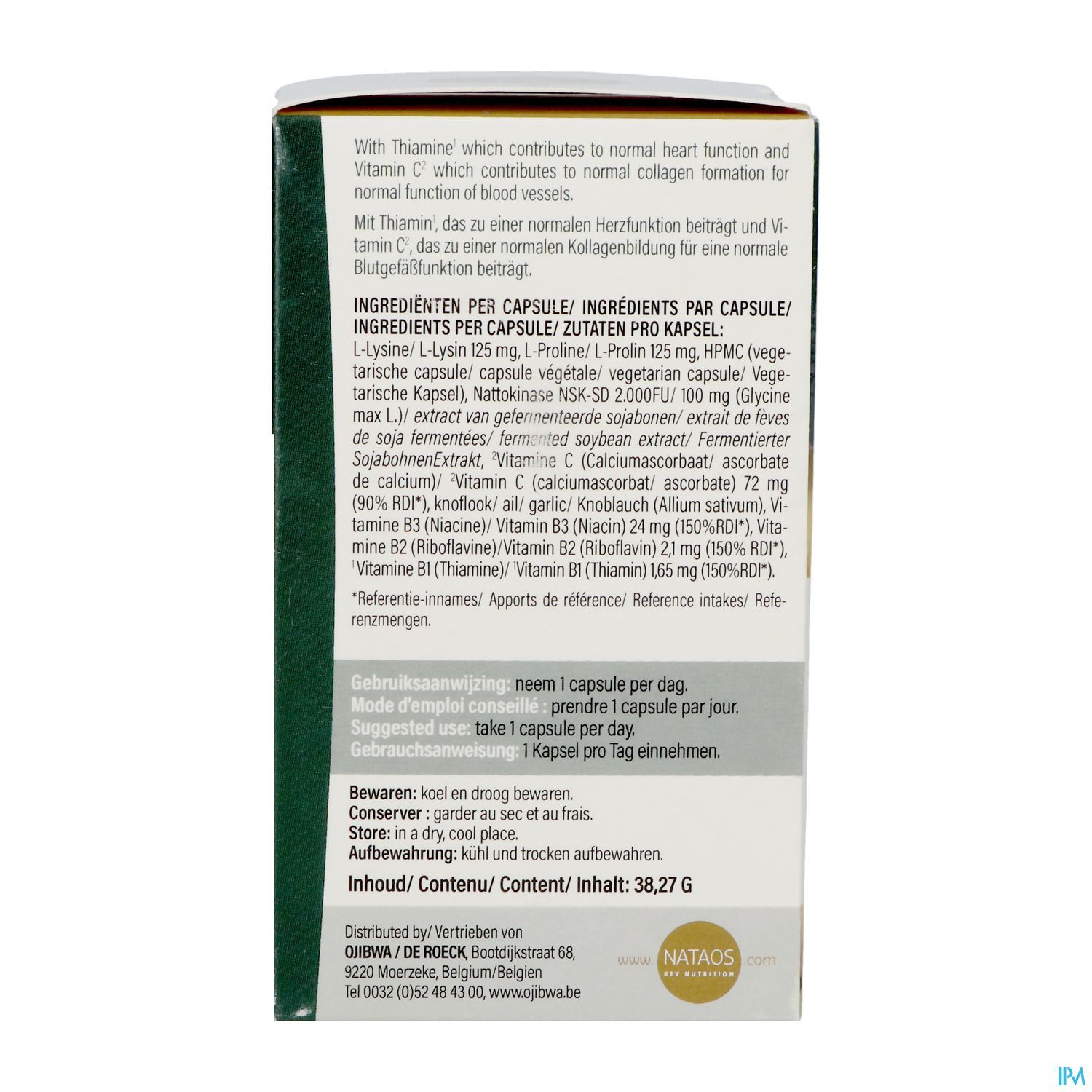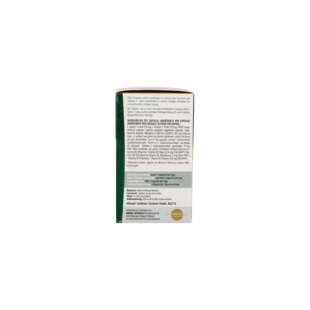 L-Lysine, L-Proline, HPMC, Nattokinase NSK-SD (Glycine max L.)/ extract van gefermenteerde sojabonen/, Vitamine C, knoflook, Vitamine B3 , Vitamine B2, Vitamine B1.
