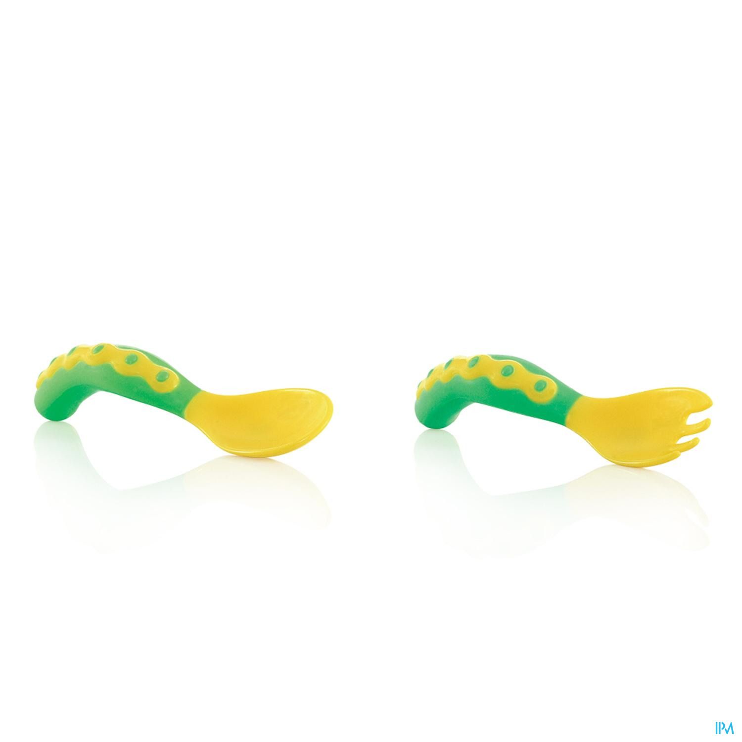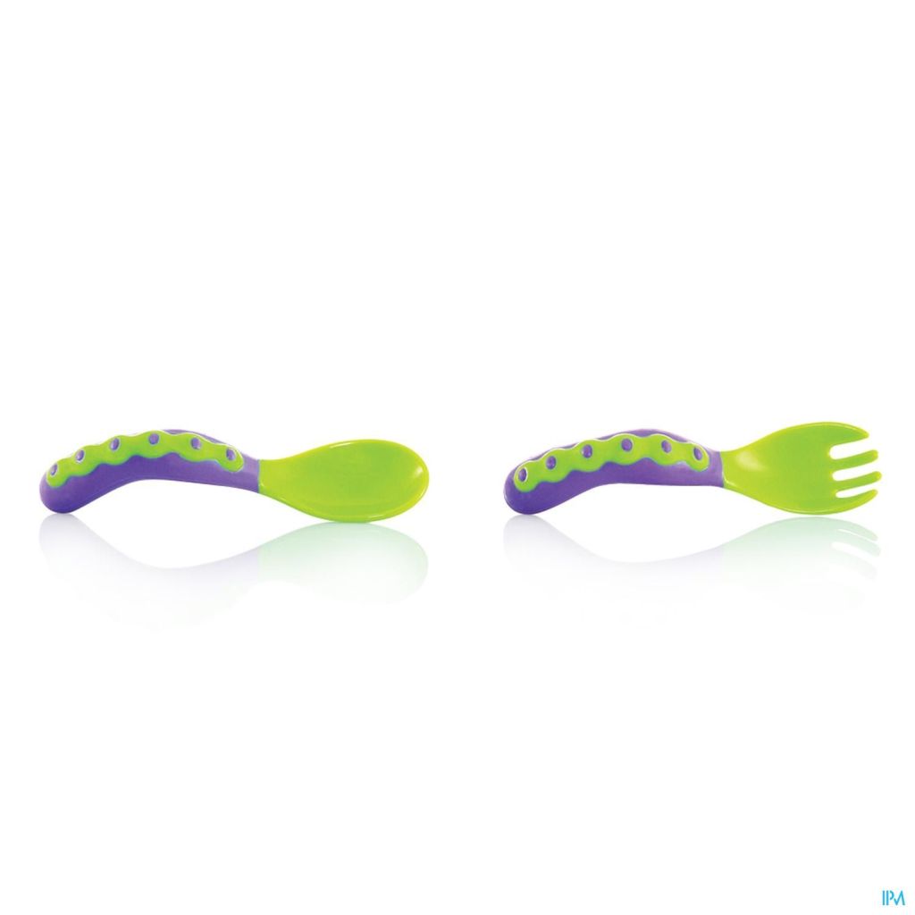 De felle vormen en kleuren van dit eerste peuterbestekje maken van elke maaltijd een feest, zonder dat het uit de hand loopt. Daar zorgen de korte, ergonomische en zachte Easy Grip™ handvatten voor. Door hun aangepaste vorm zijn ze nog makkelijker vast te nemen door kleine handen. Bovendien maken de afgeronde randen dit oefenbestekje ongelooflijk veilig om te hanteren door de allerkleinsten. Dit oefenbestekje van Nûby™ is beschikbaar in 3 leuke en felle kleurtjes en is geschikt voor kinderen vanaf 9 maanden.