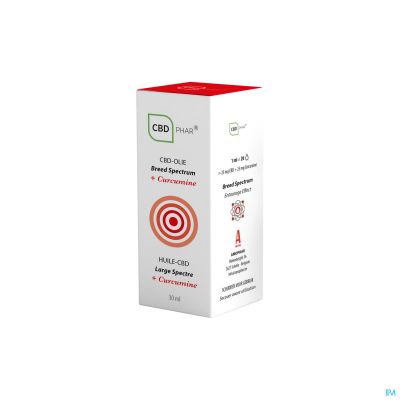 CBD-PHAR® Breed Spectrum + curcumine komt in een flesje van 30 ml. 1 ml bestaat uit 20 druppels olie en bevat 25 mg CBD en 25 mg zuiver curcumine.