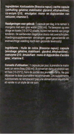 100 mg co-enzym Q10, koolzaadolie, gelatine, glycerine, water, lecithine, cellulose, antioxidant (D-alfa-tocoferol), ethylvanilline.