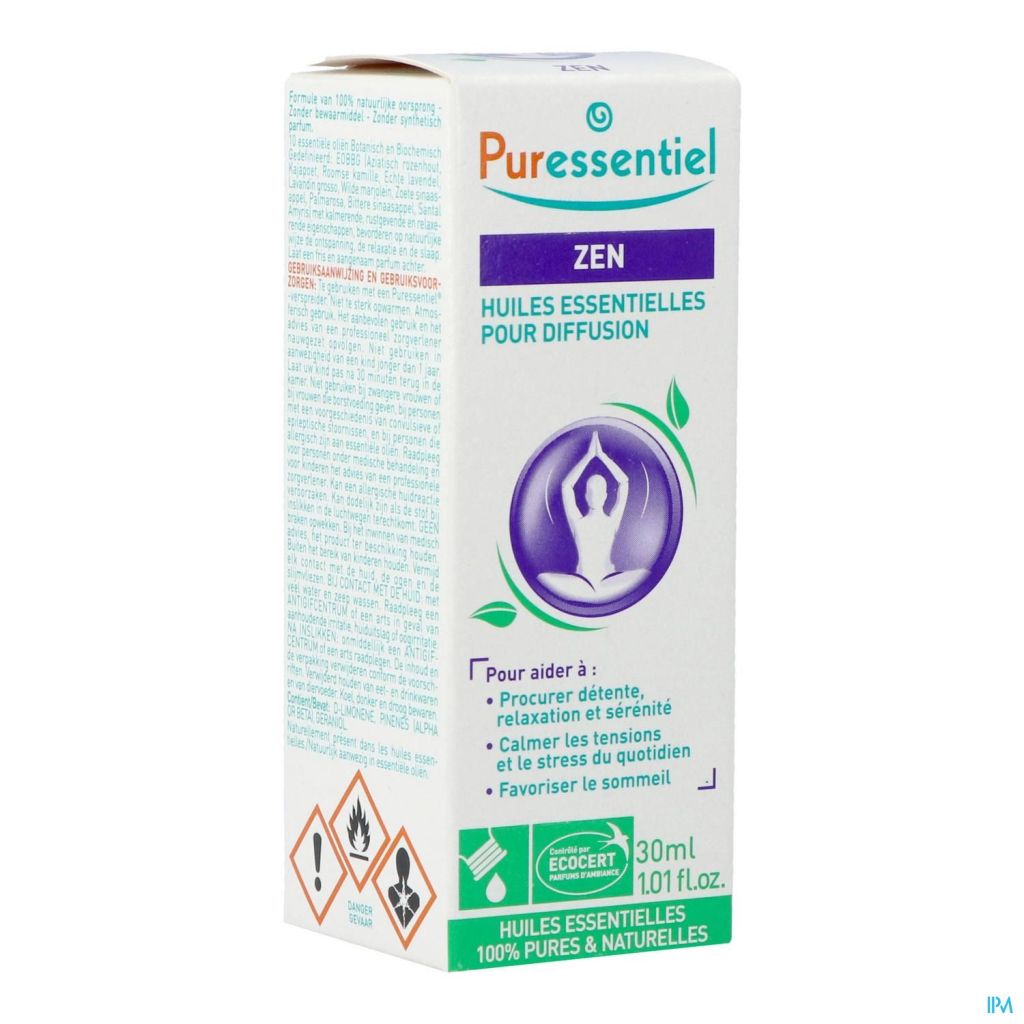 ZEN Verstuiving Puressentiel® is voor 100 % samengesteld uit 100 % pure en natuurlijke EOBBG (Essentiële Oliën Botanisch en Biochemisch Gedefinieerd) essentiële oliën om te gebruiken met de verspreider Puressentiel®. Deze essentiële oliën met kalmerende, verzachtende, ontspannende, rustgevende, onthaastende en sedatieve eigenschappen helpen op natuurlijke wijze de ontspanning, de rust en de slaap te bevorderen.