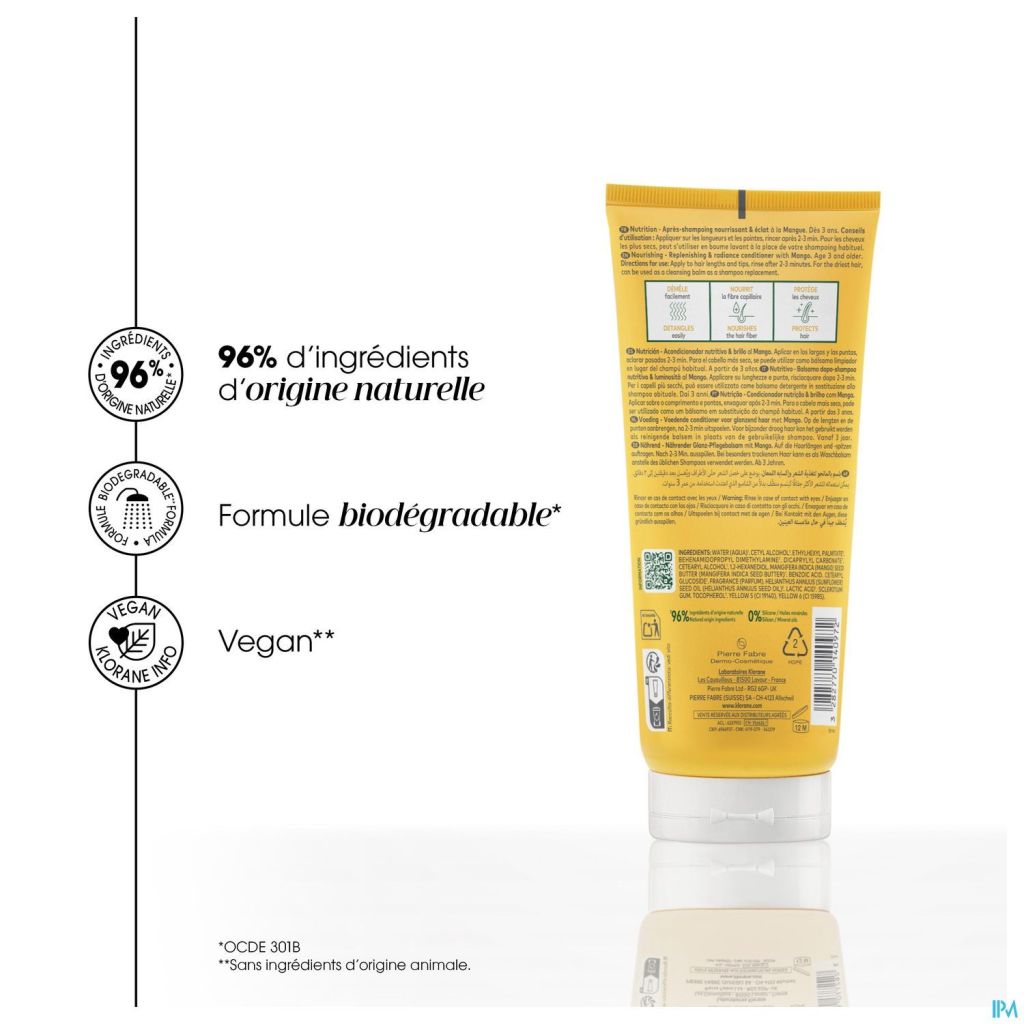 Absoluut onmisbaar voor droog haar: voedende Conditioner voor glanzend haar met Mango is dé favoriete verzorging voor haar dat hongerig is naar voeding. Zonder het haar te verzwaren, hydrateert het de lengtes en versterkt het de punten. De formule, verrijkt met Mangoboter, voedt de haarvezel diepgaand om het haar te beschermen tegen uitdroging. Met zijn zijdezachte en subtiel geparfumeerde textuur is de Conditioner de perfecte aanvullende, verwennende stap om licht en soepel haar te onthullen dat perfect gevoed en ontward is. Vanaf 3 jaar.