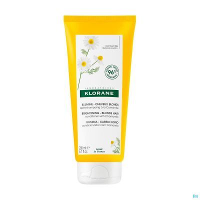 Klorane heeft de Blonde Highlights verhelderende en verzachtende conditioner met medicinale Kamille ontwikkeld om natuurlijk, gekleurd of gehighlight blond haar van het hele gezin te verzorgen, vanaf 3 jaar. Deze conditioner, die gebruikt wordt als aanvulling op de Verhelderende en Verzachtende Shampoo met Kamille, hydrateert en ontwart blond haar en geeft het glans en blonde highlights. De natuurlijke* en sensorische formule is verrijkt met kamille, een plantaardig actief bestanddeel dat het haar laat glanzen. De rijke en smeltende textuur hydrateert en maakt het haar makkelijk te ontwarren, met een zachte, vertrouwde geur.